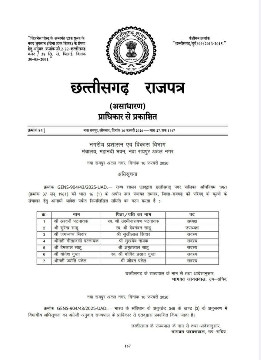 रायगढ़ : नवगठित नगर पंचायत की अधिसूचना जारी, प्रथम अध्यक्ष अश्विनी कुमार पटनायक मनोनीत
